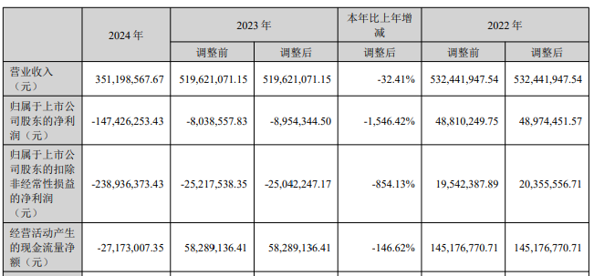 2024年年报显示,公司去年实现营业收入3.51亿元,同比下降32.41%;归属于上市公司股东的净利润-1.47亿元,上年同期为-895.43万元;归属于上市公司股东的扣除非经常性损益的净利润为-2.39亿元,上年同期为-2,504.22万元;经营活动产生的现金流量净额为-2,717.30万元,上年同期为5,828.91万元。